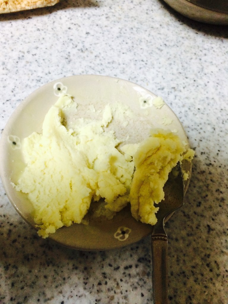分離した油を捨てて何食わぬ顔で混ぜ続けても無駄でした。マッシュポテトみたいになりました。